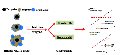 第二篇论文(Wenbo Yu 1, Jiakuan Yang*, Shuangyi Tao 1, Yafei Shi, Jiangwei Yu, Yang Lv, Sha Liang, Keke Xiao, Bingchuan Liu, Huijie Hou, Jingping Hu, Xu Wu. A comparatively optimization of dosages of oxidation agents based on volatile solids and dry solids content in dewatering of sewage sludge. Water Research, 2017, 126: 342-350.》,研究并提出了基于污泥有机物含量的污泥深度脱水药剂投加量优化新方法。因受污水厂的进水水质、天气温度、处理工艺等多方面影响,使得污水厂剩余污泥的有机物含量波动巨大,造成了目前传统的基于污泥干基(Dry solid)含量或基于污泥体积的药剂投加量优化与控制方法无法适应不同泥质污泥的实际问题。杨家宽教授研究团队提出基于污泥有机物含量的药剂优化新方法。该方法很好的克服了目前传统药剂优化及投加方法的局限性,具有广阔工程应用前景。