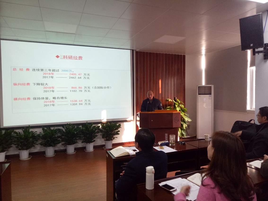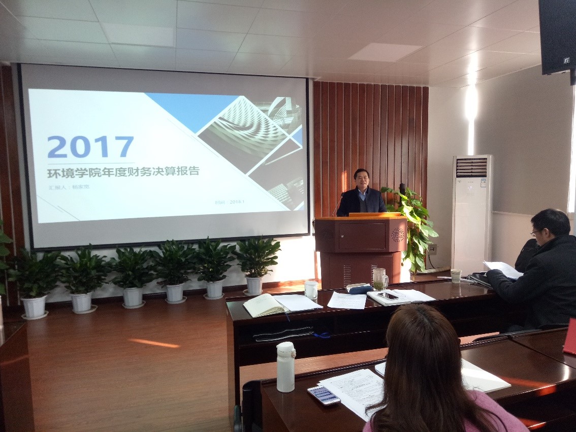 接着,院长杨家宽结合学院年度财务决算——财务概况、经费收支情况、财务制度建设、工作目标计划四个方面进行了全院年度工作总结。