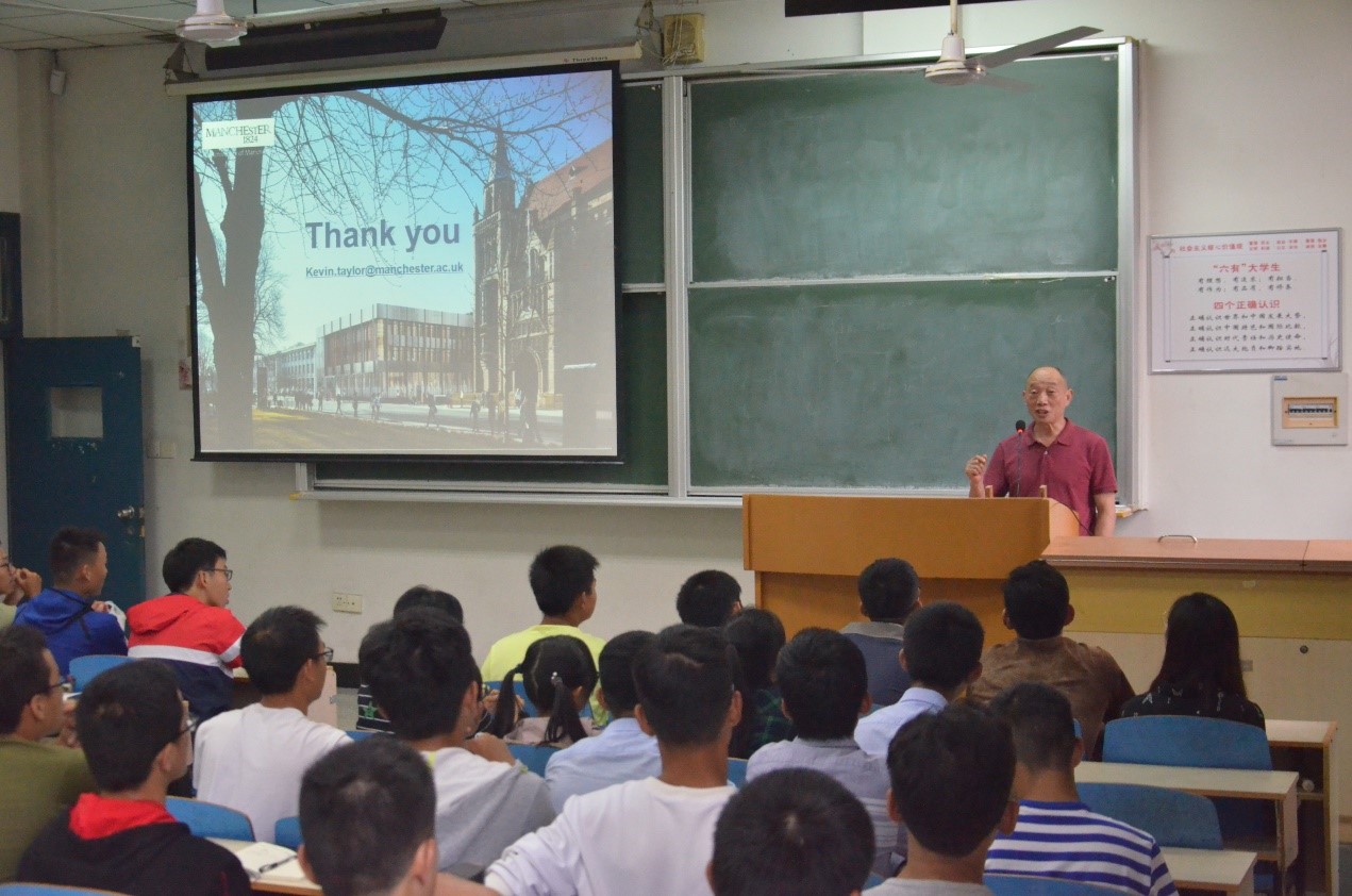 交流会后,Taylor 教授随到东九楼109教室向我院2017级、2018级本科同学作了联合培养项目专场宣讲会。Taylor教授从历史沿革、知名校友(含24名诺贝尔奖获得者)、科研成就、QS排名等方面向同学们清晰地介绍了英国工业时代的第一所大学——曼彻斯特大学,展示了曼彻斯特大学的教学规模、教育优势,环境科学专业本科生多样化、颇具特色的课程设置和培养模式,以及本科生毕业去向等,重点介绍了本次宣讲会的主题—“UoM & HUST 2+2”双学位联合培养。Taylor教授详细介绍了这一培养模式、报名资格要求及在曼彻斯特大学学习的优势,同时也介绍了曼彻斯特大学的本科生暑期交流项目的详细安排。