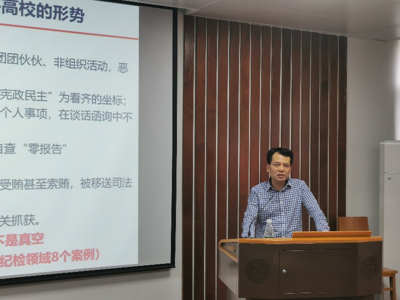 校纪委副书记、监察处处长刘继文同志应学院邀请,作“认清形势,筑牢堤坝,正风肃纪,用良好的政治生态保障学院健康发展”主题报告。报告通过分析全国和高校从严治党的形势,解读监察监督工作新格局,结合案例重点强调高校从严治党、从严治校、从严治教,重在建设风清气正的政治生态、建设青山绿水的办学生态,对学院党委抓好党风廉政建设提供了好的思路和建议,提醒广大教职工,“防微杜渐、正风肃纪”,注重日常思想教育学习和行为规范,党政学群多方共治推进学院健康发展。