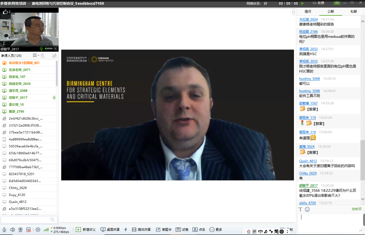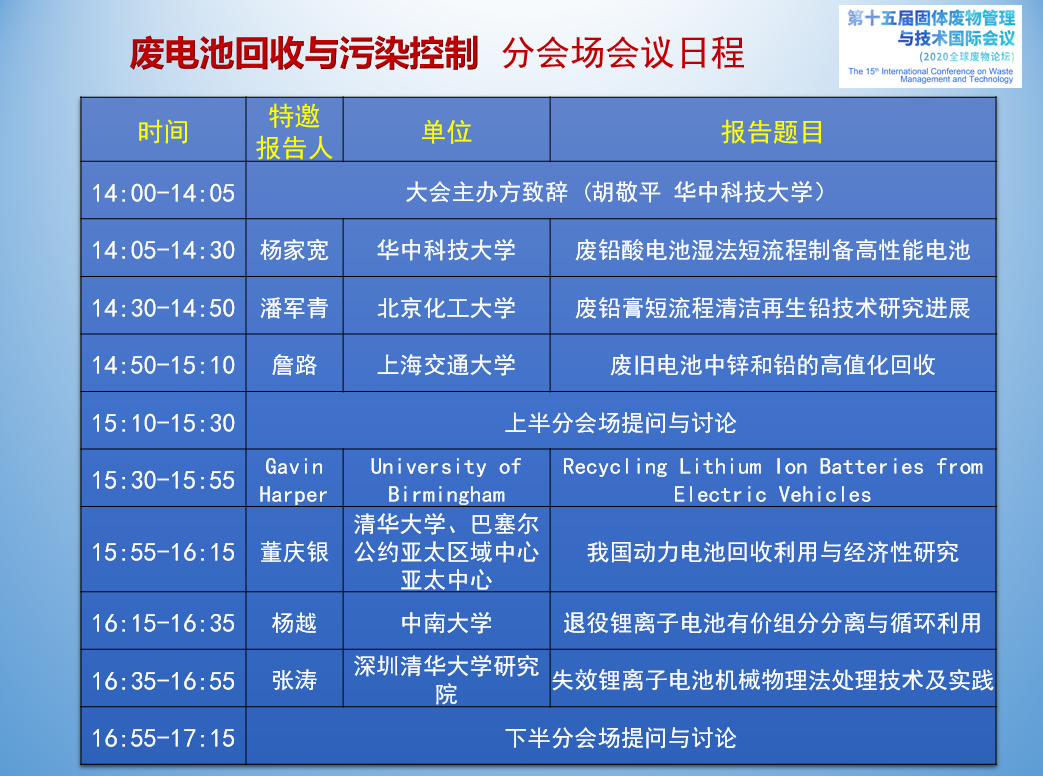 2020年6月28日(星期日)下午,第十五届固体废物管理与技术国际会议(The 15th International Conference on Waste Management and Technology, ICWMT-15)的“废电池回收与污染控制(Recycling of spent batteries and pollution control)”分论坛在线上举行(http://bcrctraining.edusoho.cn/)。