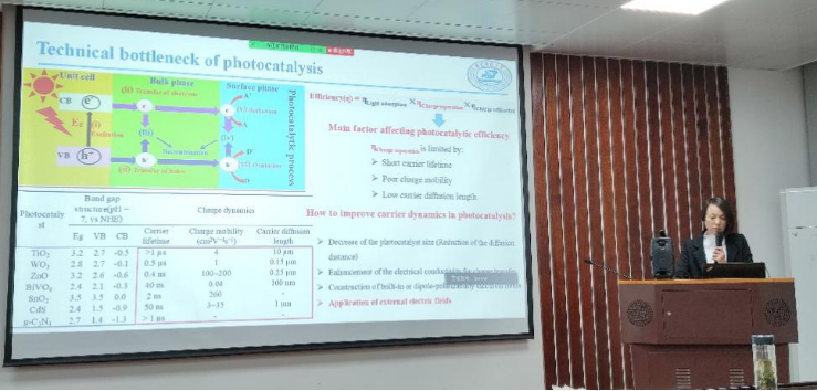 本次研讨主题集中在光催化剂、多孔材料、纳米传感材料等功能材料以及新型高级氧化技术在环境治理中的应用。在光催化方面,环境学院张延荣教授作了题为“Electrically assisting gas phase photocatalytic technique”的报告,龚建宇副教授作了题为“Influence of yolk-shell Au@TiO2 structure induced photocatalytic activity towards remediation of gaseous pollutant”的报告。圣大Irina Zvereva教授作了题为“Composite photocatalysts based on layered oxides for hydrogen production from plant biomass derivatives”的报告,Ivan Rodionov教授介绍了“Photocatalytic degradation of model organic pollutants over suspended and immobilized TiO2”。在多孔材料方面,圣大Marina Shelyapina教授作了题为“Characterization of zeolites with hierarchical porosity: Combined adsorption, spectroscopic, microscopic and diffraction techniques”的报告。在纳米传感材料方面,环境学院胡敬平教授作了题为“Nanostructured materials for electrochemical sensing of heavy metal ions in aqueous environment”的报告。在新型高级氧化技术方面,环境学院谢鹏超副教授作了题为“Activation of peracetic acid by transit metals: A new advanced oxidation process for water treatment”的报告。