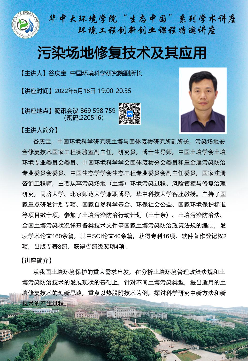 2022年5月16日晚上,应我院王琳玲老师和侯慧杰老师的邀请,中国环境科学研究院土壤与固体废物研究所副所长谷庆宝研究员在东十二楼111室为我院师生做了《污染场地修复技术及其应用》学术讲座。本次环境工程创新创业课程特邀讲座由王琳玲老师主持,环境学院师生和行业专家学者在线上线下一同参加了本次交流活动。