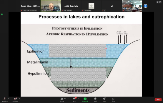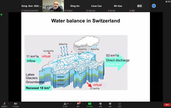 首先Urs von Gunten教授在本次线上会议中介绍了瑞士的水平衡系统,其动态变化包括流入、蒸发、降雨、降雪、下渗、流出、“虚拟水”等组成部分,整体上保持动态平衡。