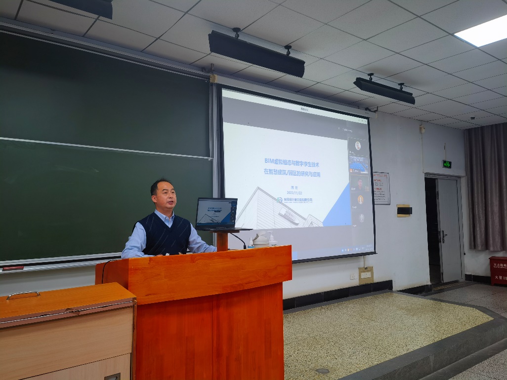 2022年11月22日晚,东风设计研究院有限公司智慧技术研究院副院长周欢先生在东十二楼F202通过线上线下方式为我院高年级本科生及研究生作《BIM虚拟组态与数字孪生技术在智慧建筑/园区的研究与应用》讲座,讲座由徐新华教授主持。