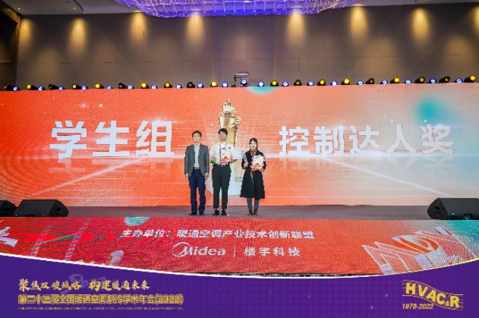 2023年4月26日,大会举办了第十九届、第二十届MDV中央空调设计应用大赛的颁奖典礼。本科生周宇珏、申君豪、李殷飞、马学明的作品《空调末端半实物模拟平台及风水一体化控制策略实践》获得 “控制达人奖”,周宇珏同学代表领奖,指导教师是徐新华、刚文杰、王飞飞。此外,本科生熊宸、揣金鑫及吴宇威、杨玉昕分别获得了第十九届、第二十届比赛学生组优秀设计奖,指导老师王飞飞获优秀指导老师奖。