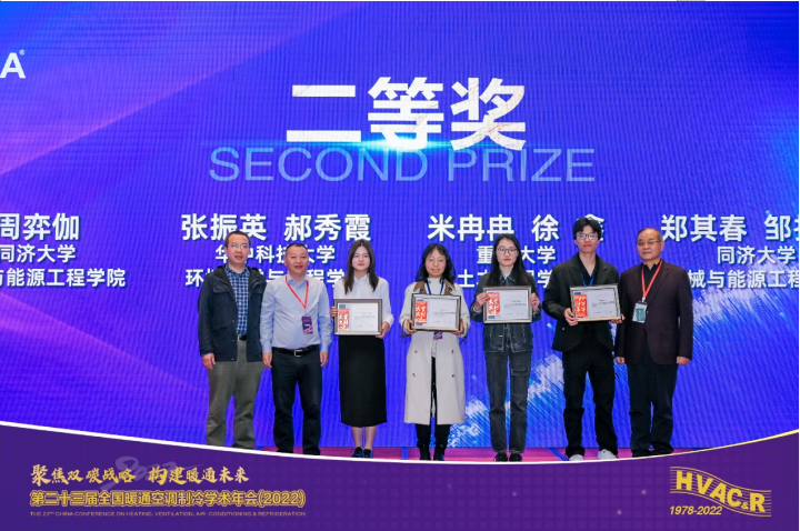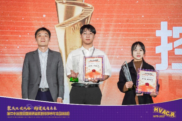 张振英、郝秀霞同学的作品《面向低层住宅群的零碳综合能源系统性能分析》获第五届“天加杯”竞赛二等奖并上台领奖,指导教师是刚文杰老师。
