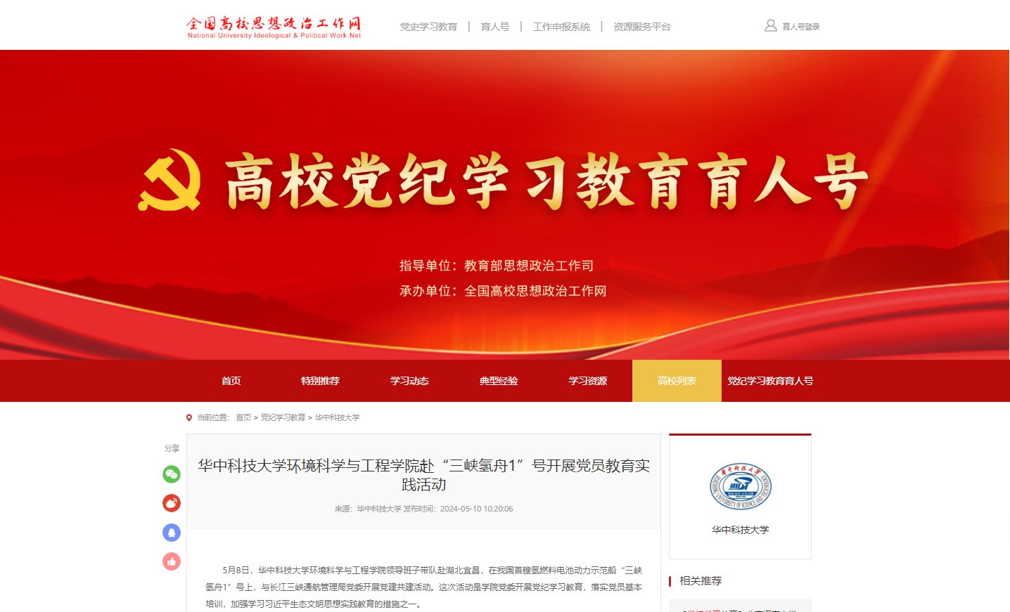 5月10日,全国高校思想政治工作网报道我院赴“三峡氢舟1”号开展党员教育实践活动。