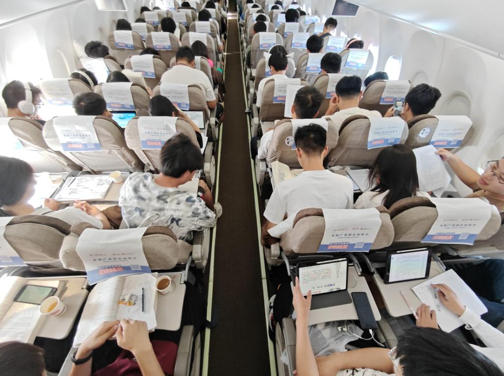 返程飞机上仍在勤奋学习的同学们