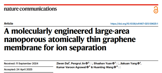 《自然》子刊Nature Communications近日在线发表了一项关于高性能离子分离膜材料的最新研究成果,题为"A molecularly engineered large-area nanoporous atomically thin graphene membrane for ion separation"(一种分子工程修饰的大面积单层多孔石墨烯膜用于离子分离)。该研究由我校与多所国际顶尖科研机构深度合作完成伟德(bevictor)官方网站环境科学与工程学院(以下简称环境学院)和长江流域多介质污染协同控制湖北省重点实验室作为论文第一单位,联合比利时鲁汶大学、澳大利亚莫纳什大学、瑞士洛桑联邦理工学院等世界一流研究机构开展了卓有成效的国际合作。环境学院2022级博士生戴子文为论文第一作者,环境学院袁书珊教授、比利时鲁汶大学靳鹏瑞研究员、澳大利亚莫纳什大学王焕庭院士共同担任通讯作者。研究团队还包括我校环境学院杨家宽教授、瑞士洛桑联邦理工学院Kumar Varoon Agrawal教授等国际知名学者。