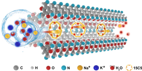 生物钠离子通道以Na⁺K⁺的高选择性和快速Na⁺传导速率为特征,在几乎所有细胞类型的生物过程中发挥重要作用。这些天然通道通常表现出10–10²Na⁺/K⁺选择性和超快的钠离子传输速率,用于维持稳态平衡和传递神经信号。近年来,因其在水处理、纳米流体器件、离子门控等领域的应用潜力开发人工生物通道的研究备受关注。尽管已设计多种人工离子通道/膜以模拟生物通道的选择性传输特性,但由于离子价态相同、裸离子(1–3 Å)与水合离子(6.5–8 Å)的亚纳米尺寸相近,以及单价离子间小于2 Å的尺寸差异,分离单价阳离子混合物仍面临巨大挑战。近年来,研究人员尝试通过将冠醚引入软脂质、石墨烯和MOF等材料中设计人工钠通道。例如,利用冠醚修饰的MOF合成的离子通道实现了高达102Na+/K+选择性,接近生物通道水平。然而,MOF材料的三维框架常导致离子扩散受限,且其结构稳定性较差。相比之下,二维共价有机框架(COF)因其局部直线型一维通道而展现出优异的离子传输性能,已被广泛应用于离子分离、能量存储等领域。但COF孔径较大(1-5 nm),在单价离子分离中的选择性有限,目前相关研究的结果仍不理想,亟需进一步探索新型功能化策略以提升其离子分离性能。