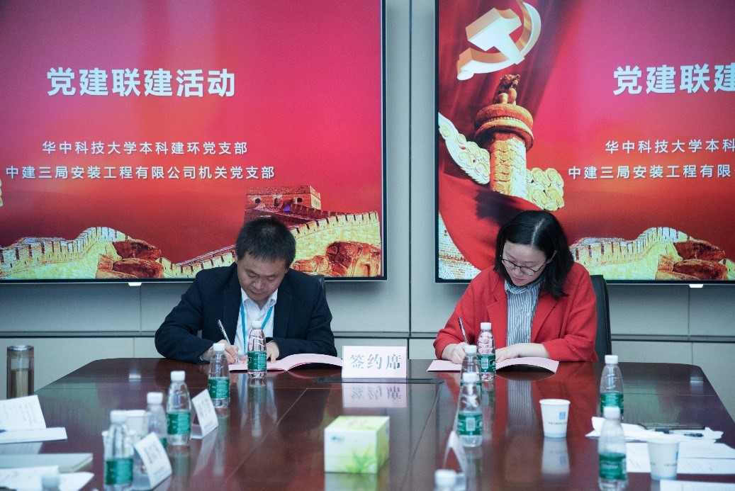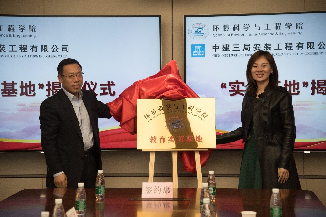 在双方交流活动结束后,本科建环党支部书记杨丹妮与中建三局机关党支部书记裴以军签订了党建联建协议书,环境学院党委副书记周雅琦与中建三局安装公司总经理、党委副书记陈志雄共同为“教育实习基地”进行了揭牌,双方达成了进一步加强合作的愿景。