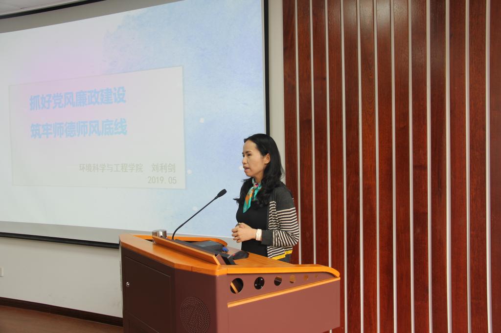 2019年5月31日,环境学院召开院教职工大会,集中开展了党风廉政建设专题学习,由院党委书记刘利剑主讲主题为“抓好党风廉政建设、筑牢师德师风底线”的党课并组织观看北省党风廉政建设纪录片《利剑反腐,重整行装》。