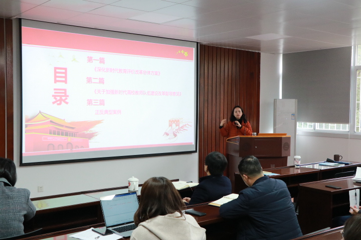 刘利剑以习近平总书记对师德师风建设的要求为引入,详细解读了《深化新时代教育评价改革总体方案》、《关于加强新时代高校教师队伍建设改革的指导意见》及教育部曝光的违反教师职业行为十项准则典型案例。刘利剑强调要将思想政治工作贯穿学校教育管理全过程,提升教师思想政治素质,加强课程思政建设,推动师德师风建设常态化、长效化,找准培养一流人才、产出一流成果的自我定位。