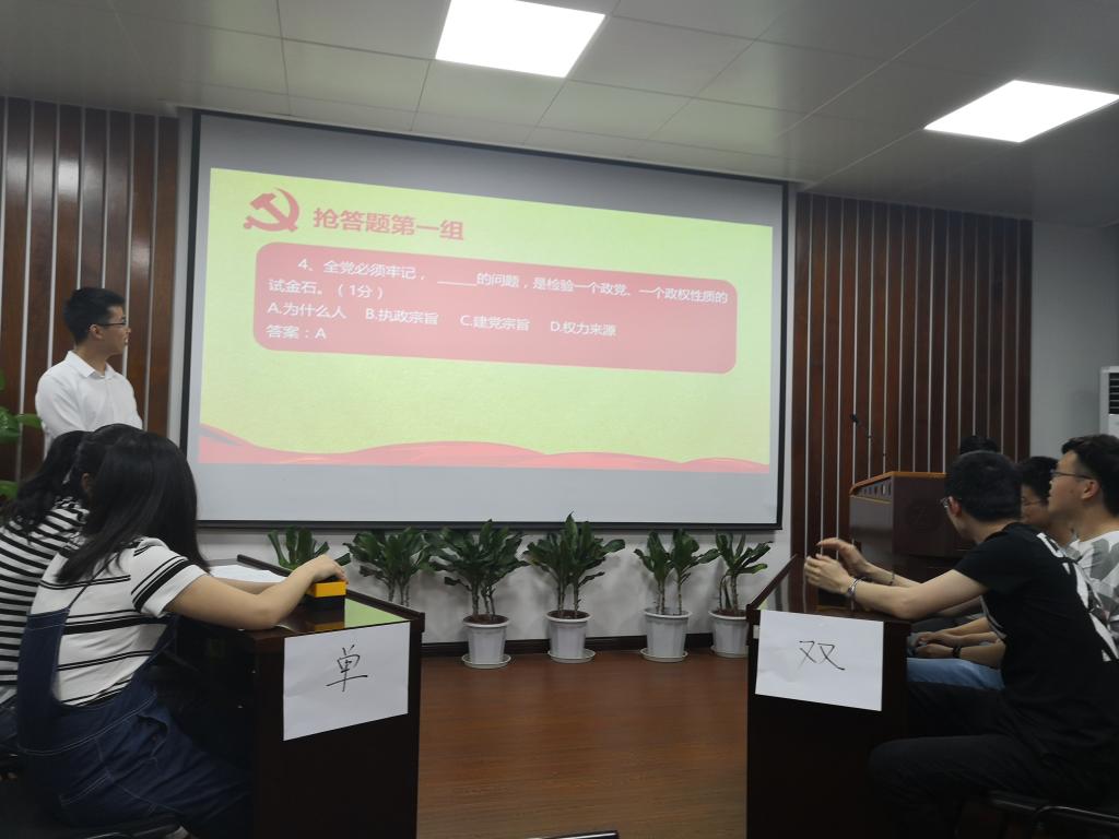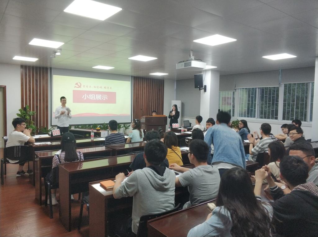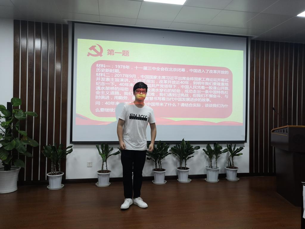 本次党史知识竞赛范围覆盖了学院研究生所有班级,参与人数众多,进入决赛的队伍共10支。决赛主要由三部分组成:笔试、抢答赛、主题演讲,考察内容涉及到党史、十九大报告、党章、改革开放和两会等各方面内容。比赛开始前,各队伍进行小组展示,鼓舞士气。经过笔试环节角逐,最终,有8支队伍成功晋级第二轮。
