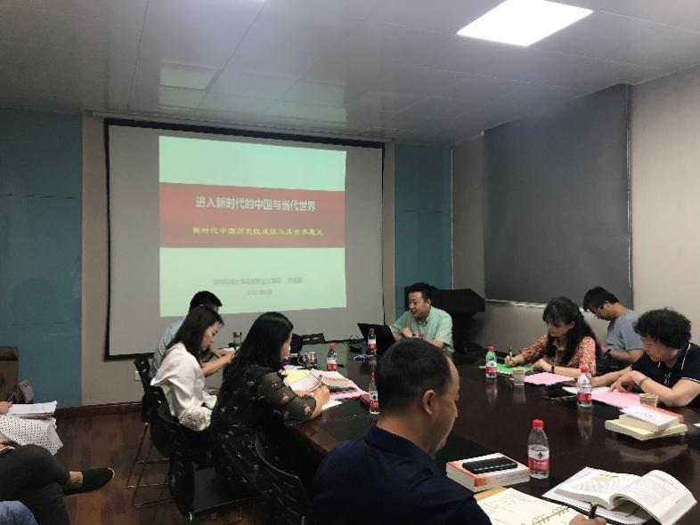 环境学院班子成员在开展学习时,每年制定详细的理论学习计划外,按月安排专人导读,同时邀请专业人士开展专题讲座。在党史学习之中国特色社会主义新时代专题,党委特邀马克思主义学院李建国教授讲授为班子成员讲授专题党课《进入新时代的中国与当代世界》。