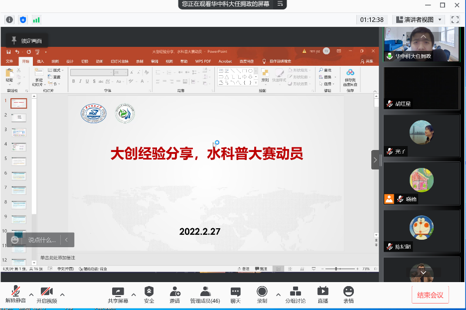 线上辅导交流的第二部分由任拥政老师向同学们介绍科创比赛项目与水科普大赛的情况。本届水科普大赛由我们学院承办,本届大赛主题为“水的回用”,可以通过科普文章、平面设计、新媒体作品等形式展现水的各类回用形式,任老师从参赛形式、赛事时间安排、参赛奖励、往届获奖作品等方面详细介绍了水科普大赛情况。任老师分享后邀请王琳玲院长为同学们指导,王院长鼓励各年级同学积极参与,可跨学科、跨专业组队。经过老师们讲解,许多同学已经表达出来了强烈的组队意愿,任老师提醒同学们可以尽快联系指导老师,与老师的交流指导中能够获得启发。
