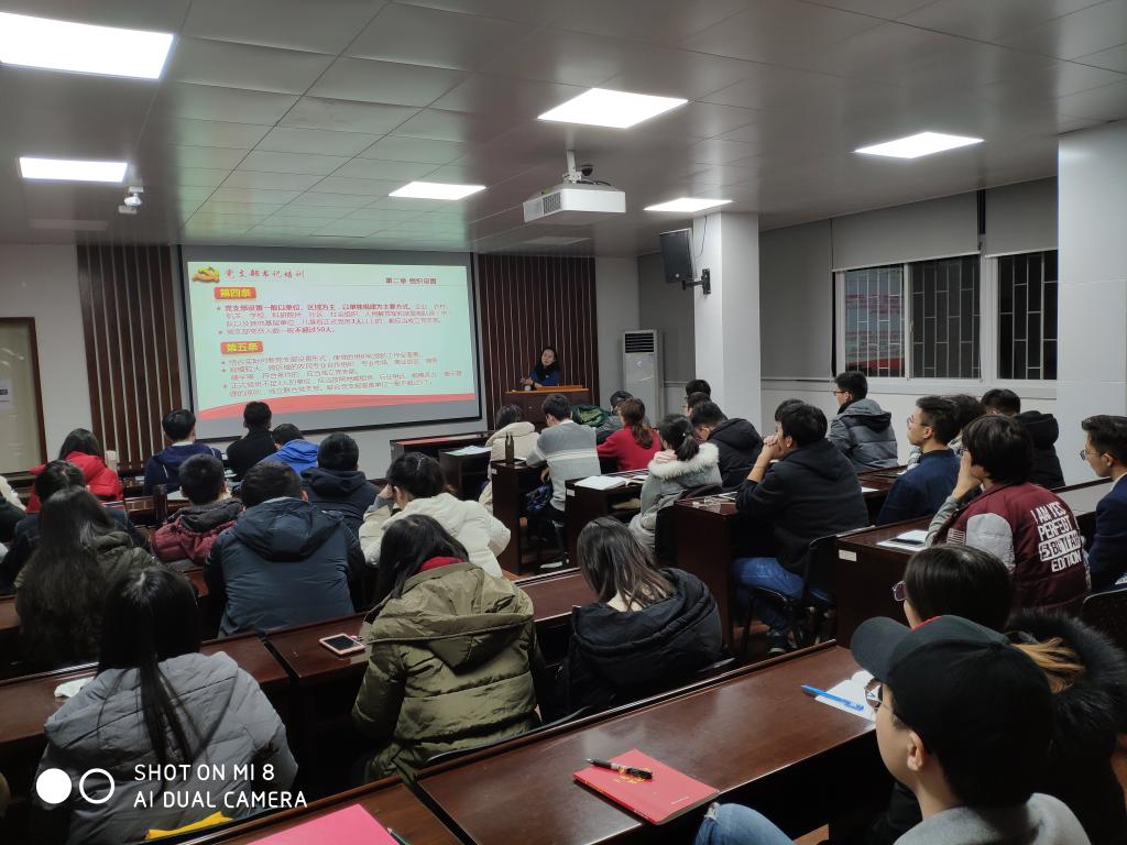在接下来的党课中,刘利剑老师逻辑严谨,条理清晰,层层推进,选取多个特色鲜明的例子对新发布的《中国共产党支部工作条例(试行)》进行了深入的剖析。通过自己亲身经历的事件,说明了党支部在抓紧占领意识形态高地上的重要性,以及支部发挥服务群众作用的重要价值。《条例》从组织设置、基本任务、工作机制、组织生活、党支部委员会建设、领导和保障等方面对支部工作作出全面规范。通过逐条逐段学习,重点对《条例》的重要意义以及《条例》中关于党支部职责、程序、遵守的工作原则等重要内容进行详细的讲解,使党员们系统掌握了《中国共产党支部工作条例(试行)》内容。刘利剑老师在党课中指出,要准确理解《条例》的含义,这是推动全面从严治党向基层延伸的重要举措,为新时代党支部建设提供了基本遵循,对加强党的组织体系建设,全面提升党支部组织力、强化党支部政治功能,巩固党长期执政的组织基础的重要举措。期间,为考察大家对党的基础理论知识的掌握程度,随机抽查了在场的学生党支书,并要求他们继续保持认真学习、毫不松懈的态度。