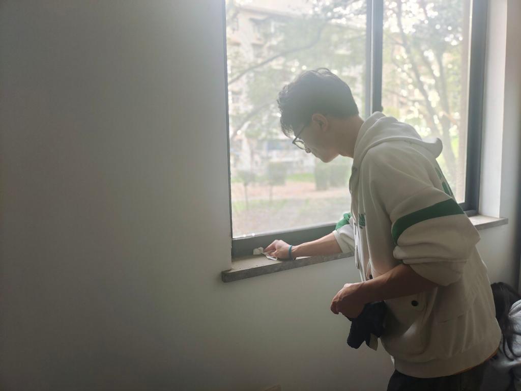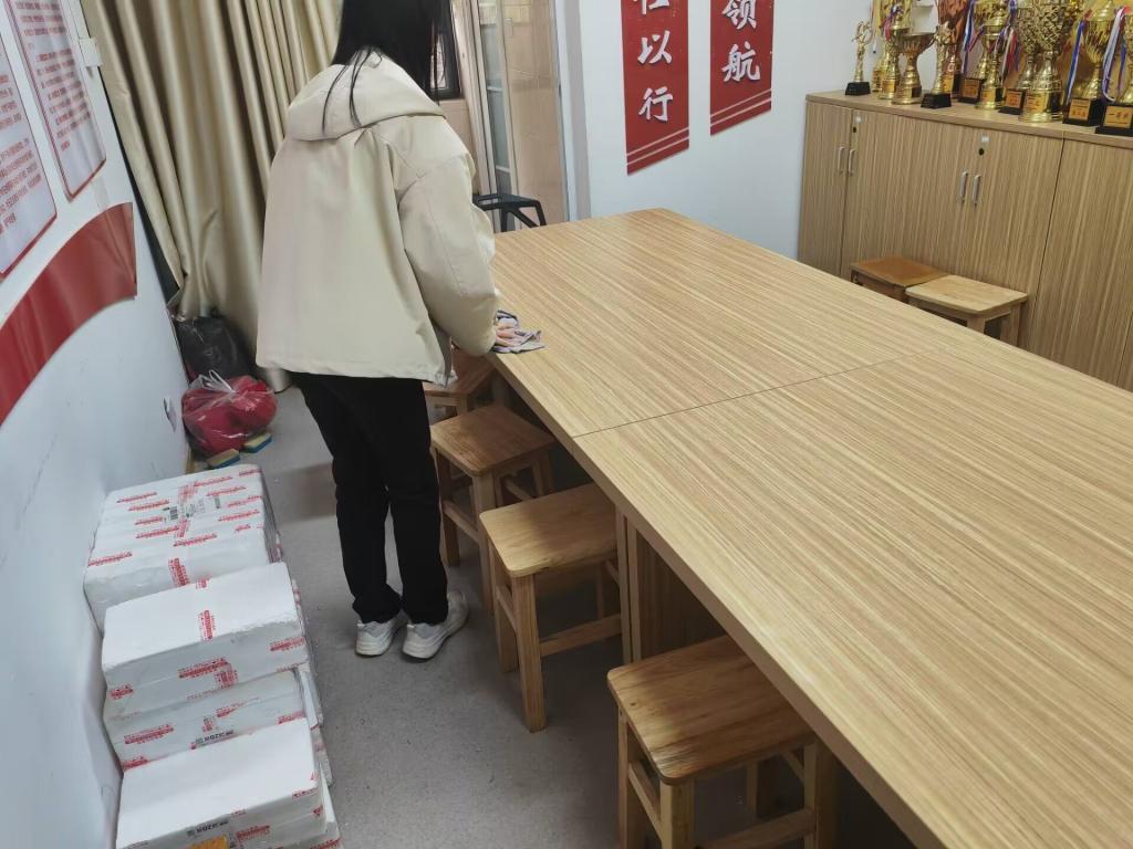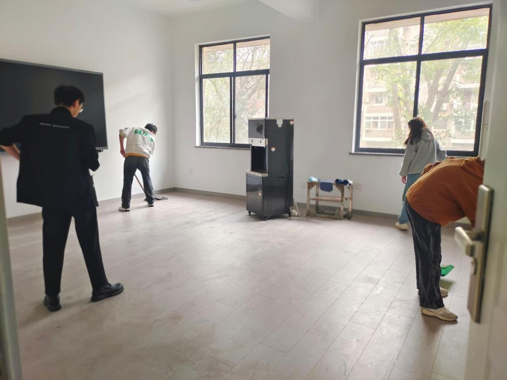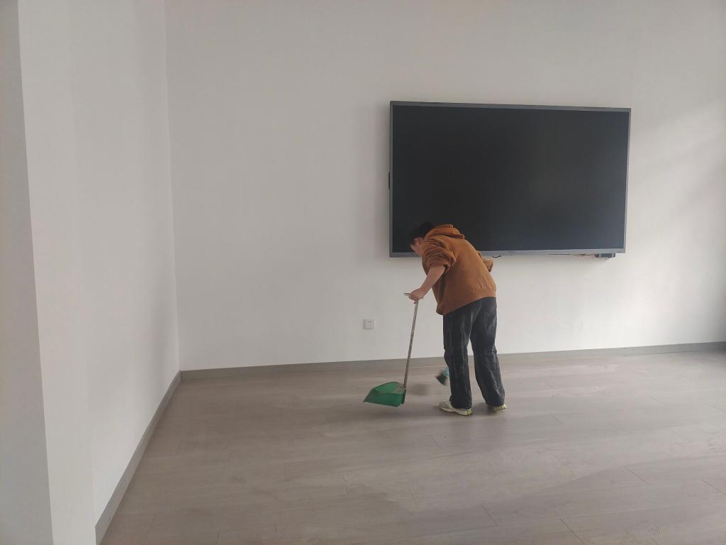 志愿者团队全面清扫欣苑一栋公用房间,墙角积尘被彻底扫除,地面恢复了光洁亮丽,为后续的会议活动提供了良好的环境。