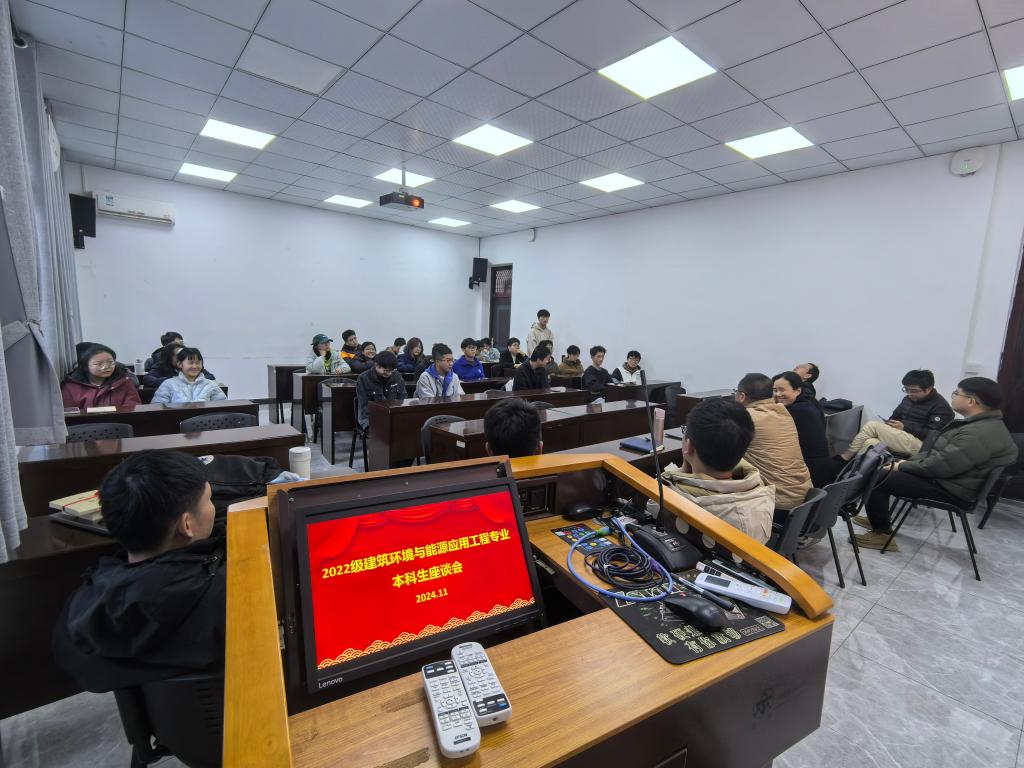 20241128日下午,在欣苑409会议室,建环系全体教师与2022级本科生进行交流,针对课程、就业、生活等展开交流。