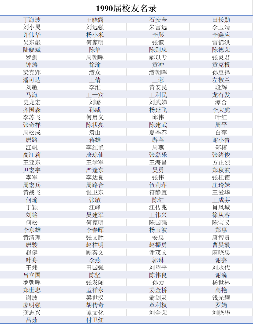 1990届本科生校友名录
