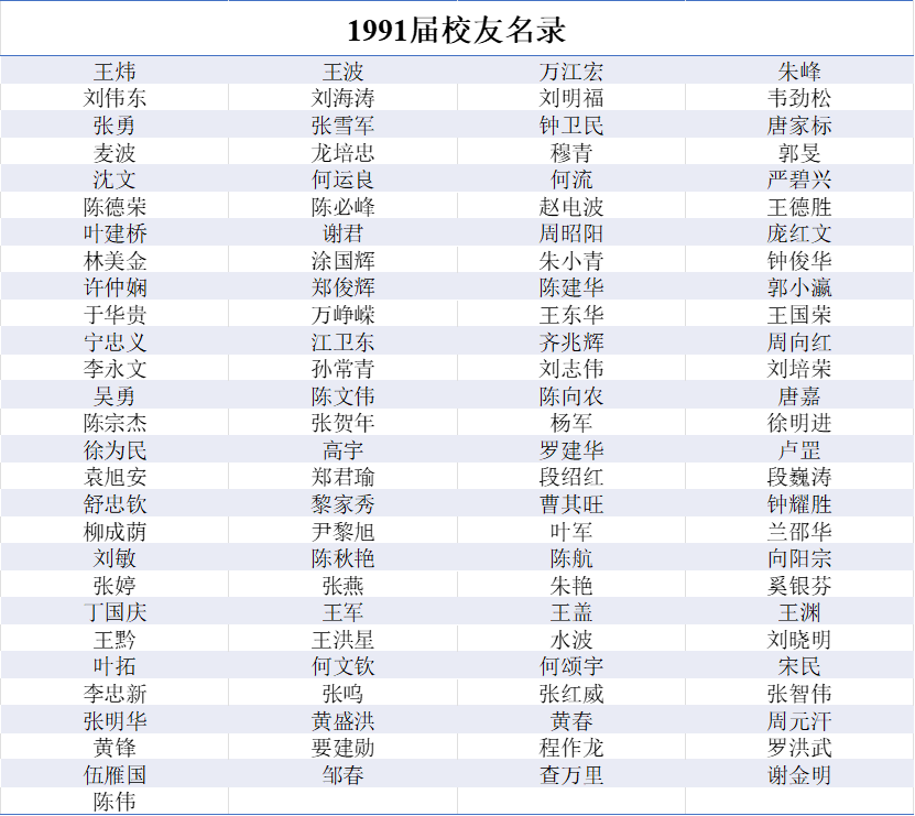 1991届本科生校友名录