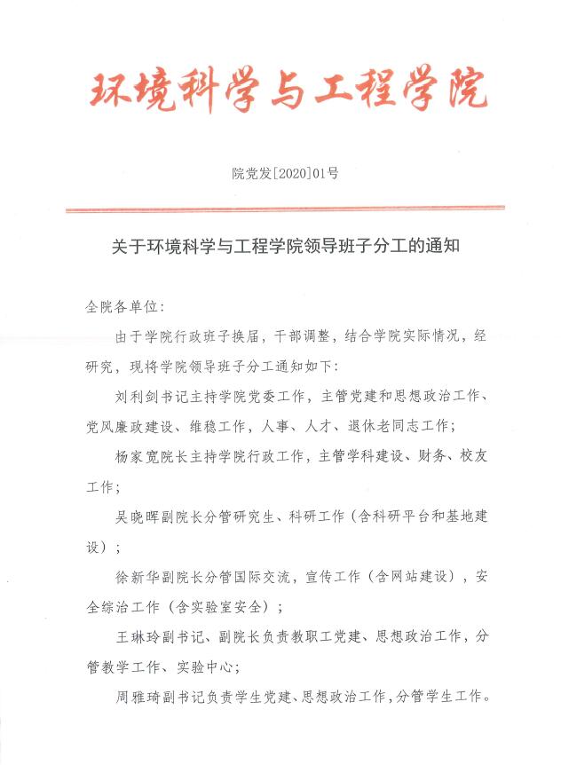 关于环境科学与工程学院领导班子分工的通知