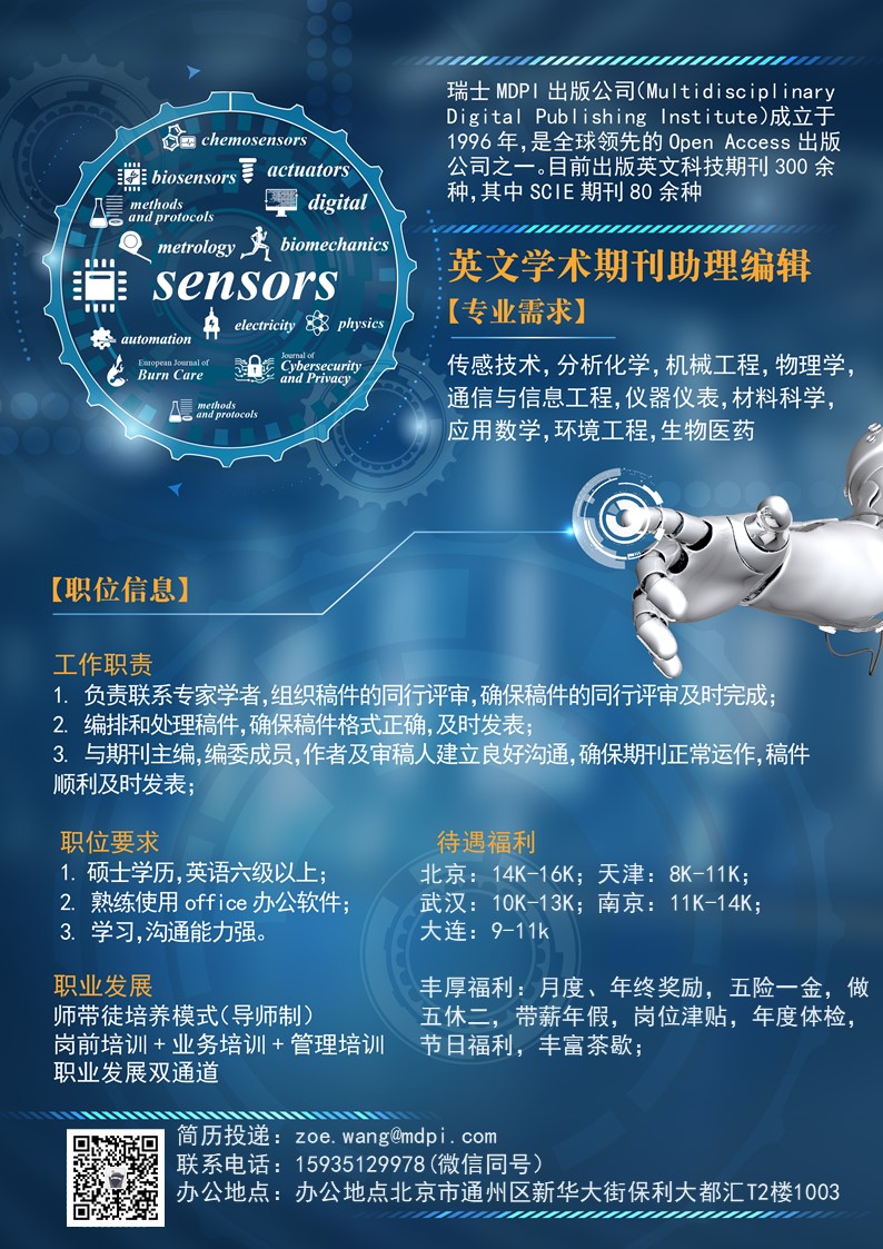 瑞士MDPI出版公司英文学术期刊助理编辑招聘
